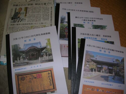 新聞を見ていたら垂井町の水野隆生さんが大垣の算額の冊子を出したという記事があった。すぐに連絡を取って算額の冊子7冊分を振り込んだが、その前に冊子が届いた。 なんと大垣の七つの神社に算額がある。金生山明星輪寺と田代神社の算額は知っていたけど、…