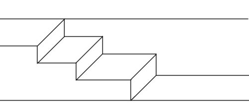 ①何が見えますか? 口々に「階段」②どんな階段? 左に上がっている。③そう見えた人?・・・間違いないね。でも、「違う」という人はいる? 天井についている段に見える。④そう見える? 見えないよ。・・この壁をこっち側に持ってくるんだ。・えっ? ・・じゃ…
