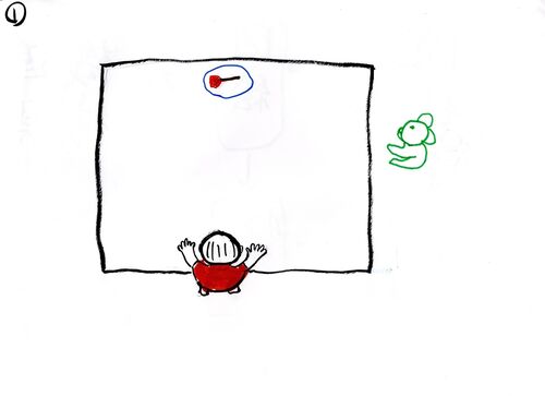 子どもたちへの「知恵とは回り道」の説明の紙芝居 つまり、回り道ができるというのが人間の知恵。 これは人間だけではない。例えばチンパンジーも知恵を持っている。 道具を使うという回り道で問題を解決するのが知恵。 この回り道を積極的に利用したのが人…