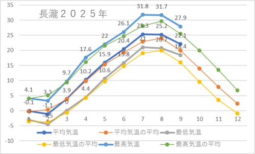 10月になったので、9月の気温を記録しておく。これは気象庁のデータ。 やはり平均よりも高い。ちなみに大鷲(中洞)の平均気温を描いてみる。何と長瀧よりも平均気温が高い。だけど、こちらの方が体感には合っている。 大鷲の最高気温と最低気温 (平均で…