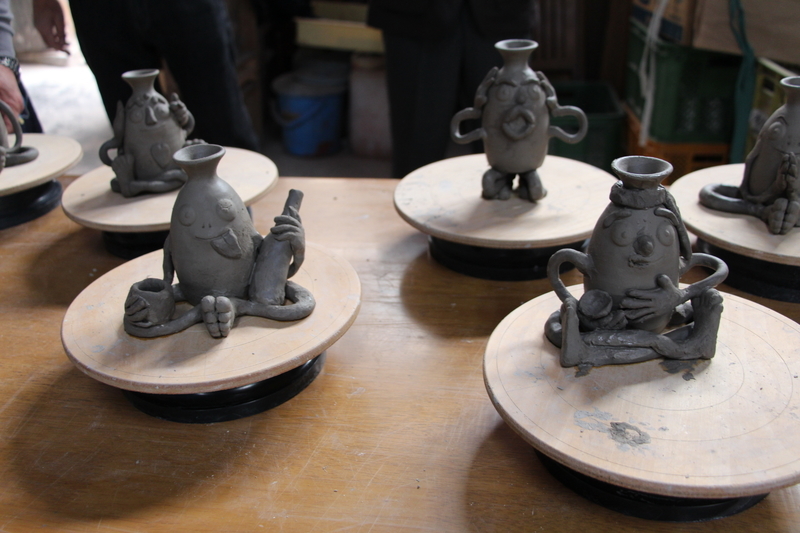 2017-11-14 「とっくりとっくん」 #文化活動 空手部の同窓会で、土岐で「とっくりとっくん」の制作に取り組んだ。 「とっくりとっくん」というのは、土岐市のゆるキャラ。 これを造ることができる窯があるということで、 山留窯さんにお世話になり、窯元の加藤さんの指導で、一時間半ほどで写真のような「とっくりとっくん」ができた。 加藤さんに3回ぐらいやった人の出来だとほめられた。 それぞれの個性が出ている。 写真の手前左の一升瓶を持っているのが私の作品。 いつものように、よく飲んでよくしゃべった。